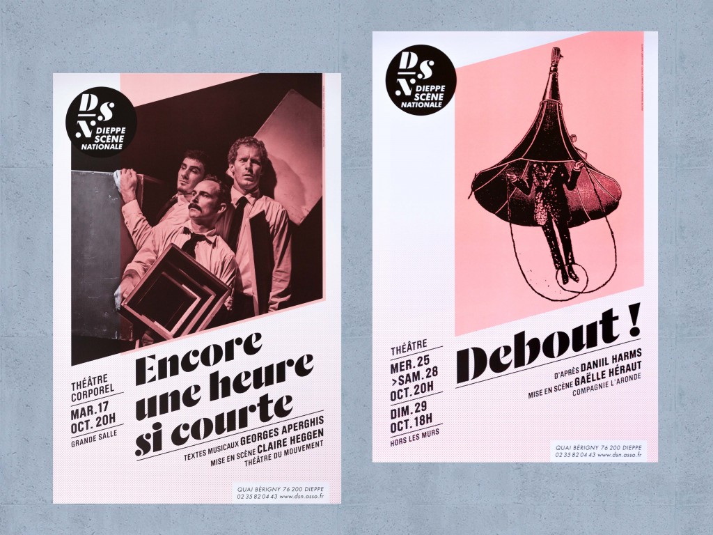 Un système d’affiche spectacle repérable, dynamique et élégant, dans une économie d’impression en deux tons, le noir et orange fluo.