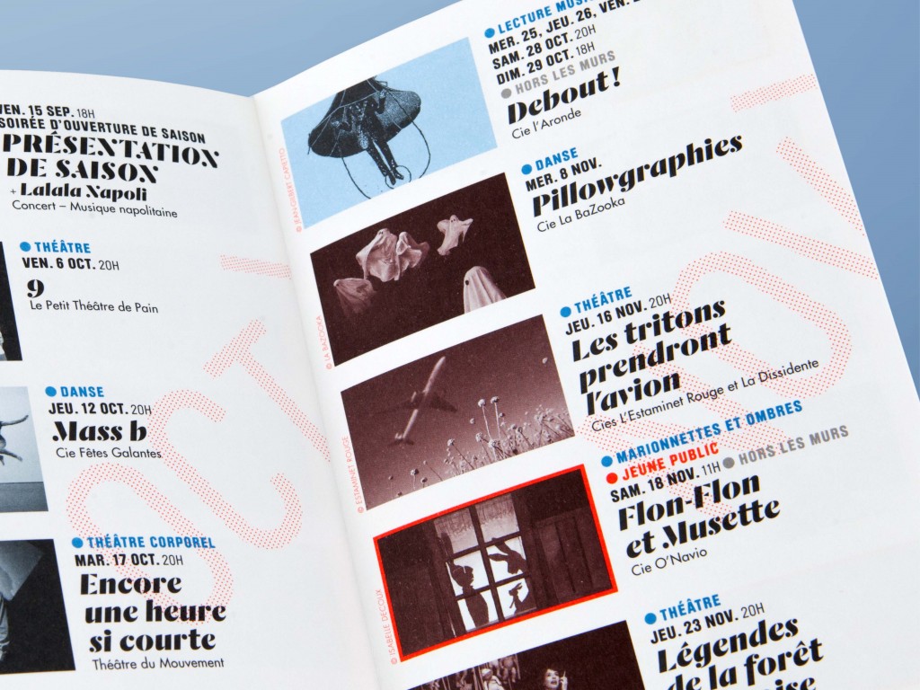 La couverture du programme foisonne d’images évoquant la diversité des domaines artistiques proposés par DSN – théâtre, cinéma, musique, jeune public… – et les émotions qu’ils suscitent.