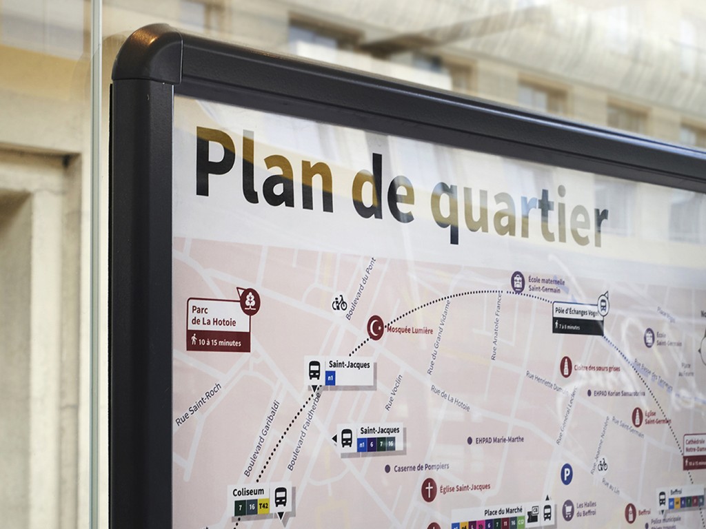 Que ce soit sur papier, sur écran ou sur des dalles de pierre, une attention particulière a été accordée à la cohérence entre les supports. La lisibilité et l'intelligibilité ont été constamment validées par la réalisation de prototypes.